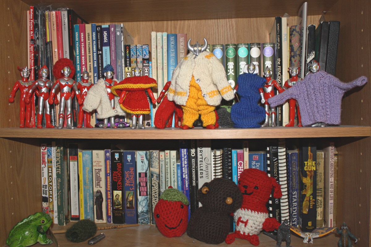 Proud Ultramen in knitted glory look out from their bookshelf across the vast bedroom. They are never cold, always cozy, cheering us up every time we see them.