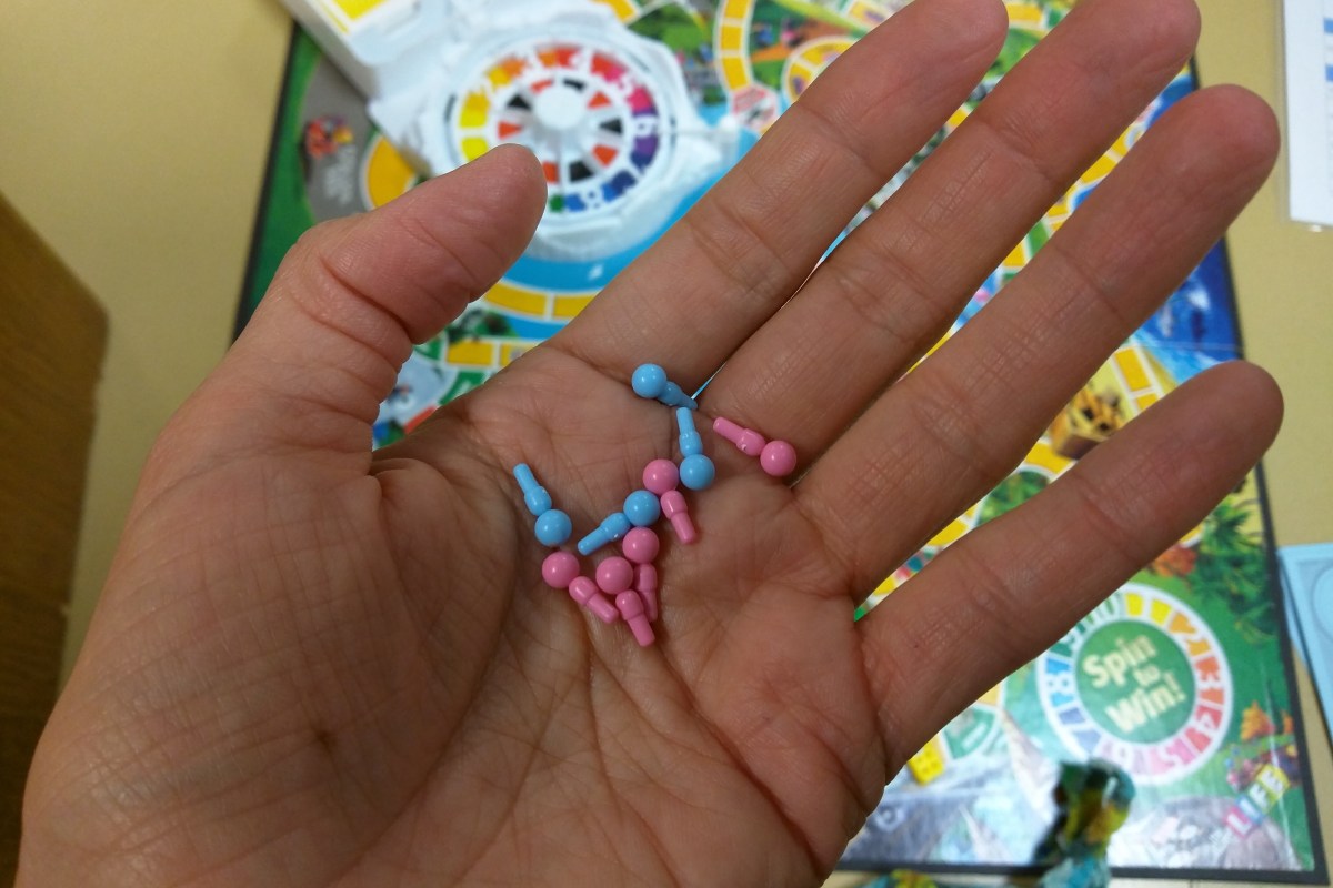 If you’re not familiar with this board game, it has little plastic convertible cars that you fill with blue and plastic pegs that represent people. You spin the wheel and get lucky—or unlucky—spins.